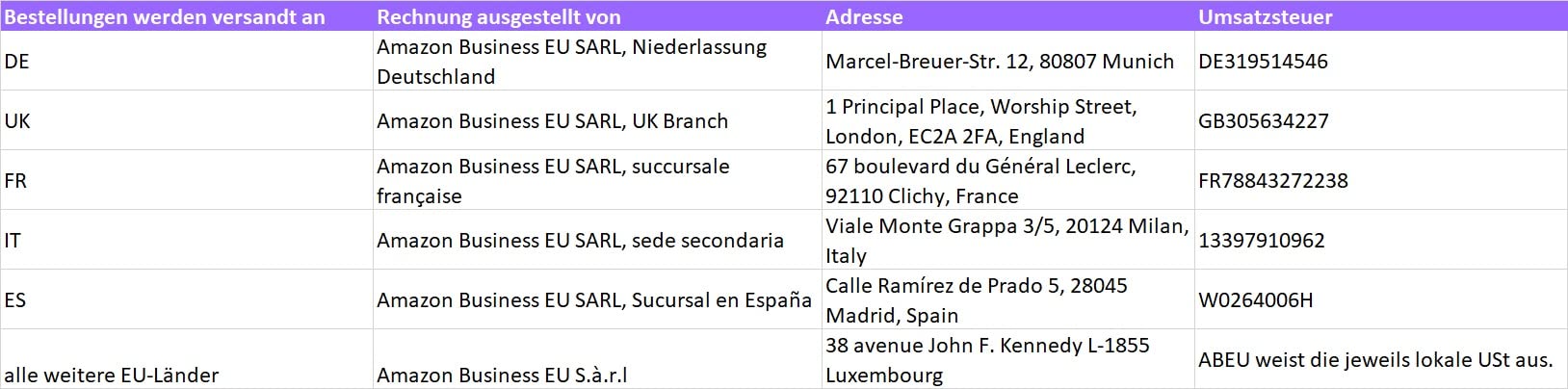 Derzeit bietet Ihnen „Rechnung durch Amazon“ (1-Kreditor Modell) die Möglichkeit, von einem einzigen Lieferanten - Amazon Business EU SARL (ABEU)- Artikel zu kaufen und Rechnungen zu erhalten. Dabei handelt es sich um eine in Luxemburg gegründete und steuerlich ansässige Gesellschaft.